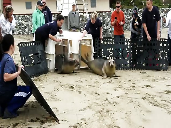 2 PHOQUES LIBÉRÉS SE FONT UN POUTOU AVANT DE PARTIR