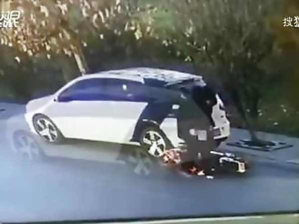 UNE SCOOTÉRISTE DISTRAITE S’ÉCRASE SUR LA LUNETTE ARRIÈRE D’UNE VOITURE (CHINE)