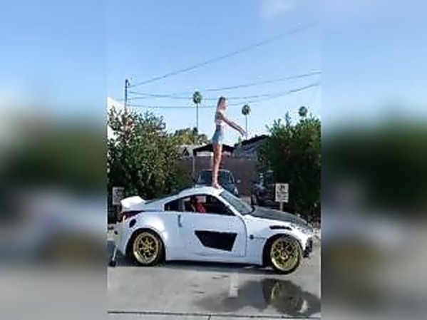 BLESSÉE AUX JAMBES APRÈS LE SALTO ARRIÈRE SUR LA VITRE D’UNE NISSAN 350Z