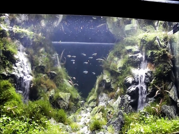DEUX CHUTES DE SABLE EN CIRCUIT FERMÉ DONNENT L'ILLUSION DE CASCADES DANS L'EAU D'UN AQUARIUM