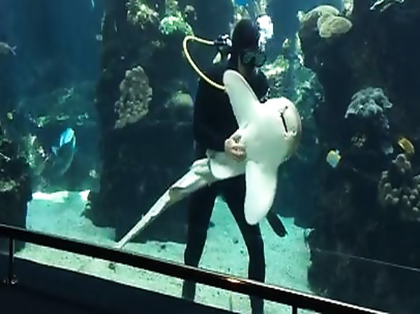 UN REQUIN-LÉOPARD S'APPROCHE D'UN TECHNICIEN QUI NETTOIE LA VITRE POUR SE FAIRE CARESSER