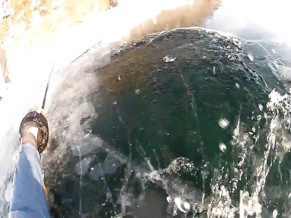 DEUX HOMMES ENFLAMMENT DES BULLES DE MÉTHANE SE TROUVANT À LA SURFACE D'UN LAC GELÉ