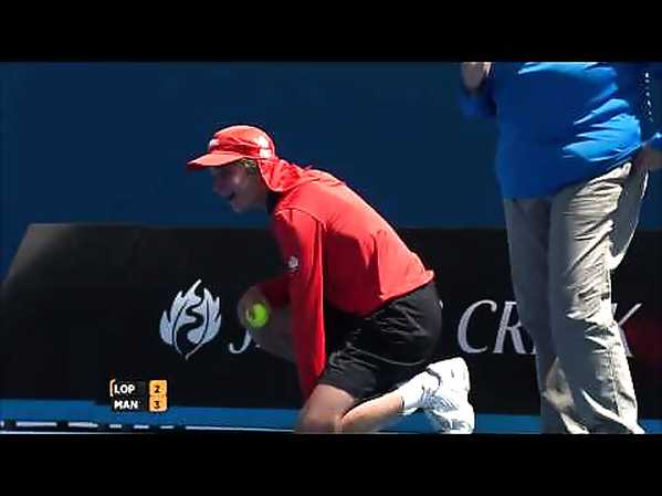 PENDANT L'OPEN D'AUSTRALIE, UN RAMASSEUR DE BALLE REÇOIT UNE BALLE DE TENNIS ENTRE LES 2 JAMBES À 196 KM/H