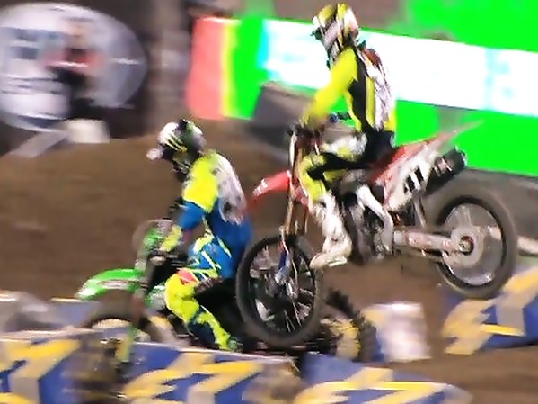 LORS DU ANAHEIM II SUPERCROSS AU ANGEL STADIUM (CALIFORNIE), CHAD REED A ÉTÉ PERCUTÉ TREY CANARD ALORS QU’IL ÉTAIT EN PLEIN SAUT