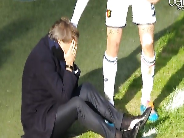 LORS DU MATCH DE L’INTER MILAN FACE À LA GENOA (3-1), L’ENTRAINEUR ITALIEN ROBERTO MANCINI SE PREND UN BALLON EN PLEINE TÊTE
