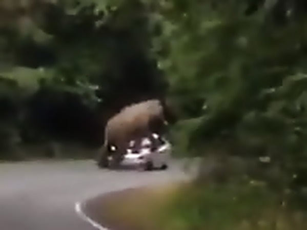 ELÉPHANT ÉCRASE L'AVANT D'UNE VOITURE