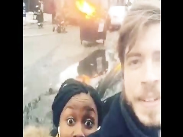 UN HOMME ET UNE FEMME SE FILMENT DEVANT UNE POUBELLE EN FEU