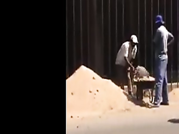 DEUX HOMMES TRAVAILLENT EN ÉQUIPE POUR DÉPLACER UN TAS DE SABLE