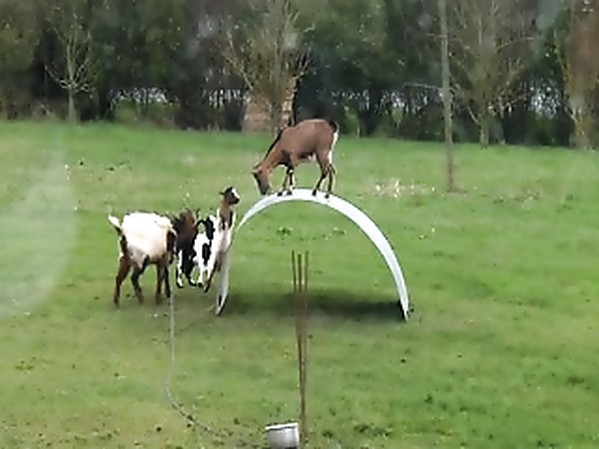 DES CHÈVRES JOUENT À RESTER EN ÉQUILIBRE SUR UNE TÔLE