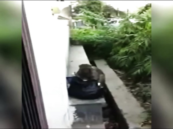 UN SINGE ENTRAIN DE FOUILLER DANS LES POUBELLES S'ÉNERVE LORSQU'IL S'APERÇOIT QU'ON L'ESPIONNE