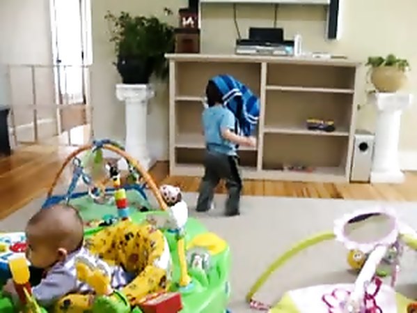 SALE GOSSE S'AMUSE AVEC UN SAC ET SE PREND LE COIN DE LA TABLE