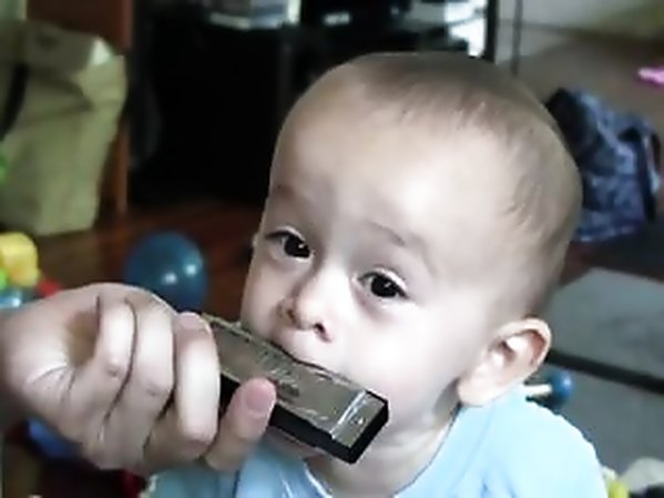 UN JEUNE GAMIN TENTE DE JOUER DE L'HARMONICA