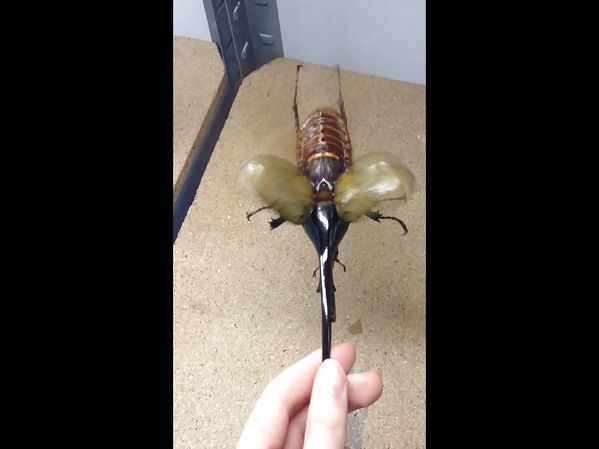 UN HOMME S’AMUSE AVEC UN DYNASTE HERCULE, L’UN DES PLUS GROS INSECTES AU MONDE