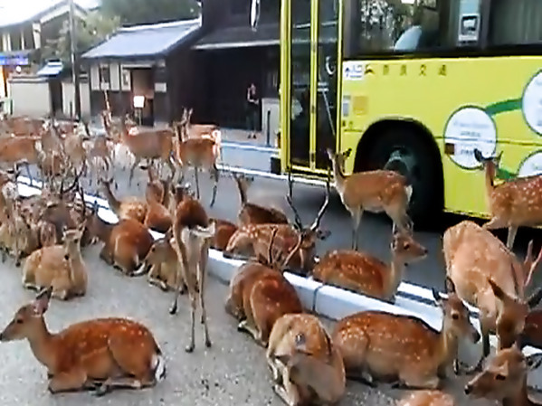 DES BICHES AU BORD DE LA ROUTE, PROFITENT DE L'OMBRE UN SOIR D'ÉTÉ (PARC DE NARA , JAPON)