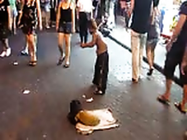 ARTISTE DE RUE OFFRE UN SPECTACLE BIZARRE AVEC UN CHIEN EN MANQUE