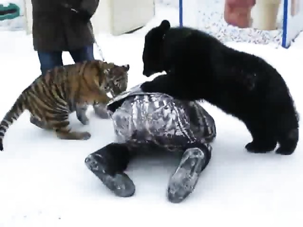 UN RUSSE S'AMUSE AVEC SES ANIMAUX DE COMPAGNIE: UN OURS ET UN TIGRE