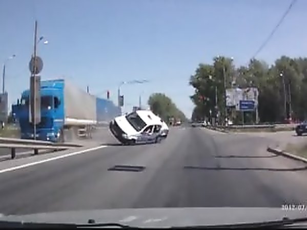 AUTOMOBILISTE GRILLE UN FEU ROUGE ET LE PAYE ILLICO EN SE FAIT PERCUTER PAR UN CAMION