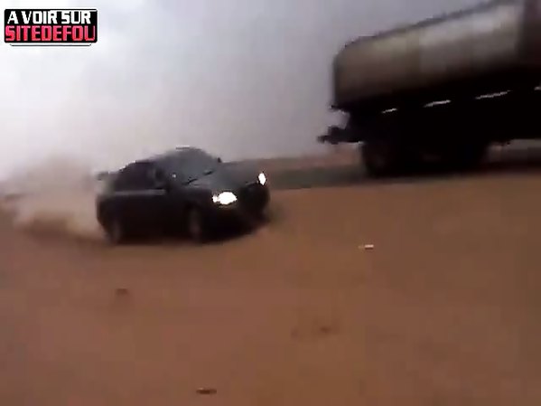 AUTOMOBILISTE RESTANT DANS L'ANGLE MORT D'UN CAMION SE FAIT POUSSER PAR CE DERNIER
