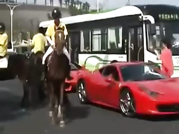 CHEVAL JALOUX MET UN COUP DE PIED DNAS UNE FERRARI