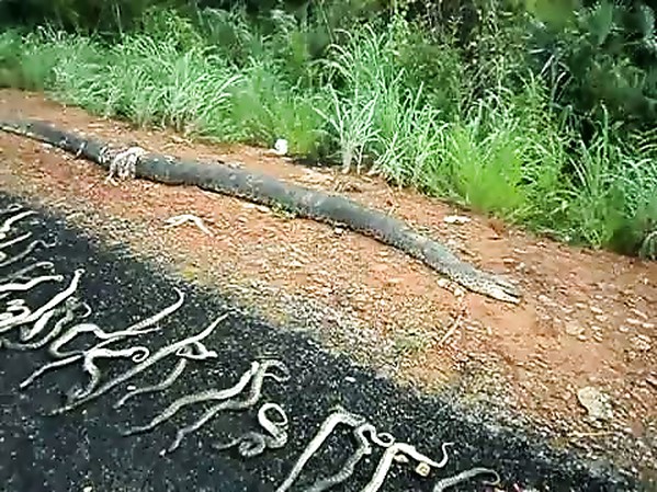FEMELLE ANACONDA SUR LE POINT DE METTRE BAS ÉCRASÉE PAR UNE VOITURE (CARNAGE)