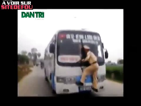 POLICIER SE TIENT À L'AVANT D'UN BUS (WTF ?)