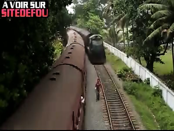 FOU SE PROMÈNE SUR UN CHEMIN FERROVIAIRE ALORS QU'UN TRAIN ARRIVE DERRIÈRE LUI