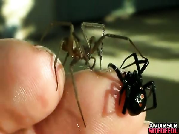 UNE ARAIGNÉE VEUVE NOIRE ET UNE RECLUSE BRUNE DANS SA MAIN