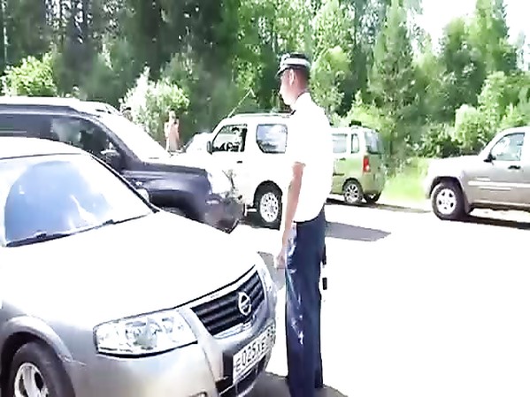 POLICIER RUSSE TIRE SUR LE PNEU D'UNE VOITURE