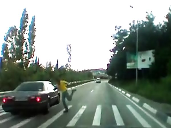 UN PIÉTON CHANCEUX PASSE TRÈS PRÈS DE SE FAIRE ÉCRASER