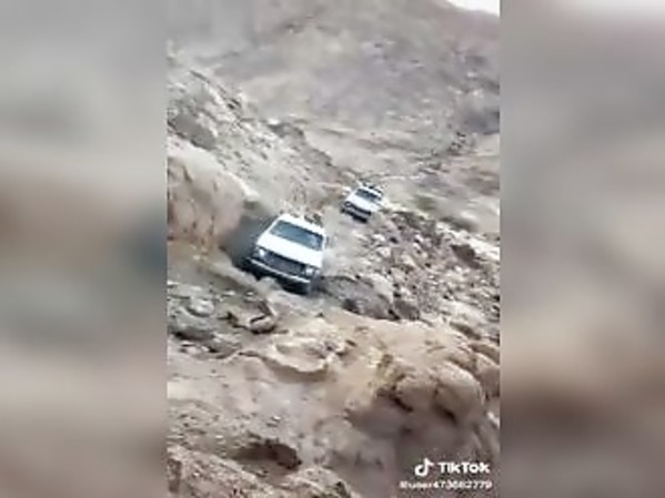 DEUX VOITURES SUR UNE ROUTE TOTALEMENT DÉFONCÉE (YÉMEN)