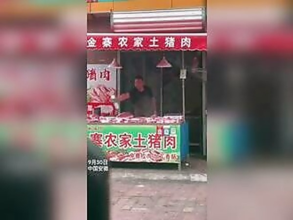 UN BOUCHER CHINOIS FAIT FUIR LES MOUCHES DE SON ÉTAL