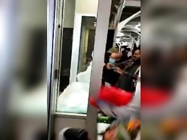 DES MANIFESTANTS TENTENT DE FAIRE COUCHER UN BUS (ÉTATS-UNIS)