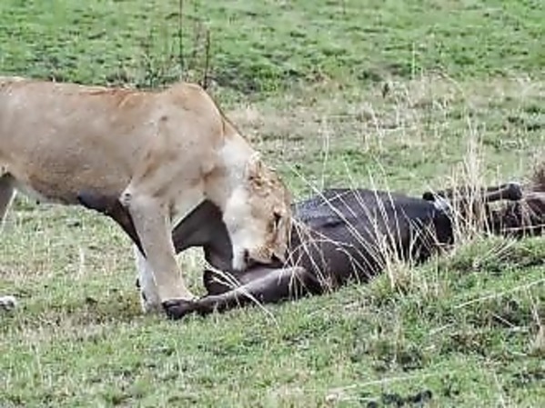 UNE LIONNE SE RÉGALE AVEC LES TESTICULES D’UN GNOU
