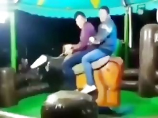 DEUX HOMMES PRENNENT LEUR PIED SUR UN TAUREAU MÉCANIQUE