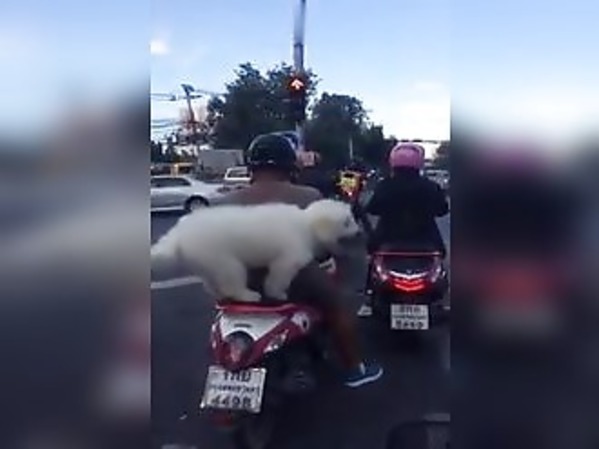 UN CHIEN FAIT TRANQUILLEMENT DE LA MOTO AVEC SON MAÎTRE