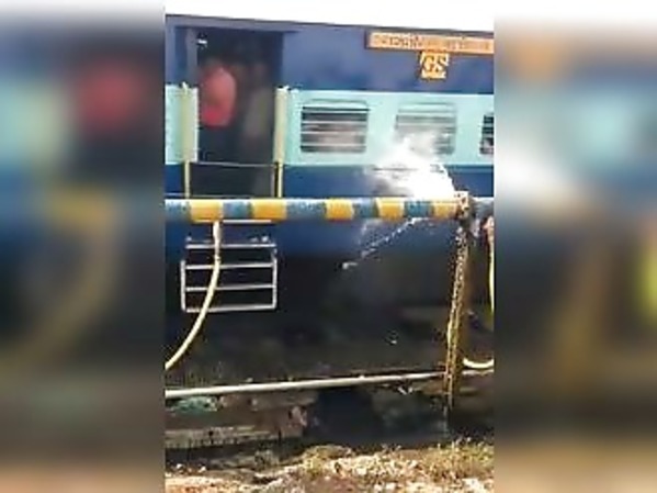 DES PASSAGERS D’UN TRAIN SE PRENNENT UN GROS JET D’EAU (INDE)