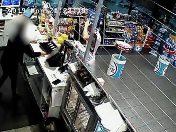 UN VOLEUR À MAIN ARMÉE CACHE SON VISAGE AVEC UN SAC SUR LA TÊTE