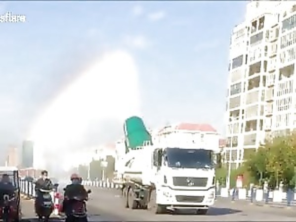 UN CAMION D’ARROSAGE LAISSE UN BEL ARC-EN-CIEL DERRIÈRE LUI (CHINE)