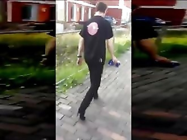 IL MARCHE DANS LA RUE AVEC DES CHAUSSURES À TALON POUR FEMME…