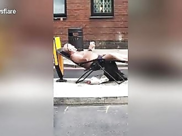 LONDRES : INSTALLÉ SUR UN TERRE-PLEIN CENTRAL, UN HOMME TORSE NU PREND DU BON TEMPS DANS SA CHAISE LONGUE