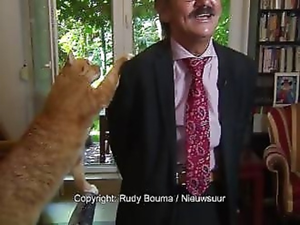 POLOGNE : UN CHAT GRIMPE SUR LES ÉPAULES DE SON MAÎTRE QUI EST EN PLEINE INTERVIEW