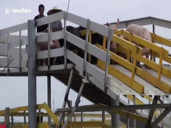 CHINE : POUR LES MAINTENIR EN FORME, UN ÉLEVEUR OBLIGE SES COCHONS À FAIRE UN PLONGEON DE 3 M DANS L’EAU