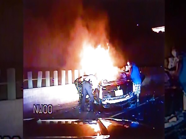 ÉTATS-UNIS : TROIS POLICIERS ET DEUX BRAVES CIVILS SAUVENT DEUX PERSONNES COINCÉES DANS UNE VOITURE EN FEU