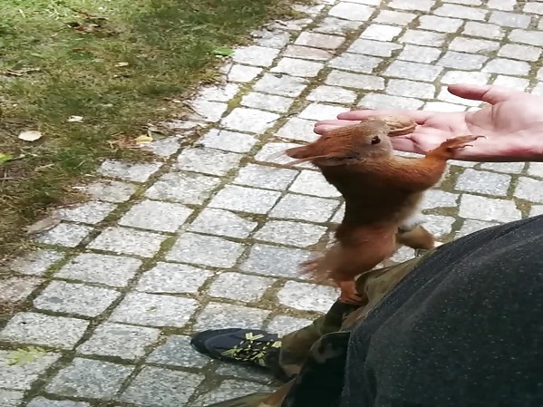 PAS DU TOUT EFFRAYÉ PAR LA PRÉSENCE HUMAINE, UN ÉCUREUIL SAUVAGE GRIMPE SUR UN HOMME POUR PRENDRE UNE NOISETTE