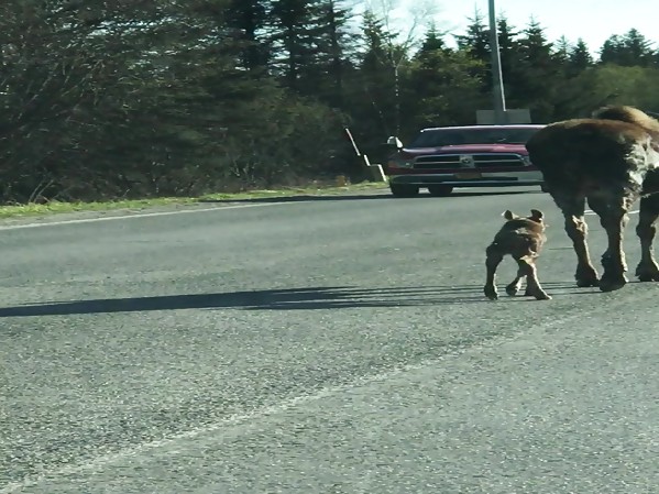 ALASKA : UNE FEMELLE ÉLAN ET SON PETIT QUI VIENT DE NAÎTRE SE PROMÈNENT AU MILIEU D’UNE ROUTE