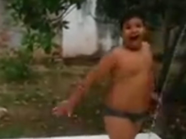 UN ENFANT EN MAILLOT DE BAIN RÉALISE UN DAB ORIGINAL EN GLISSANT SUR UN SOL MOUILLÉ EN CARRELAGE