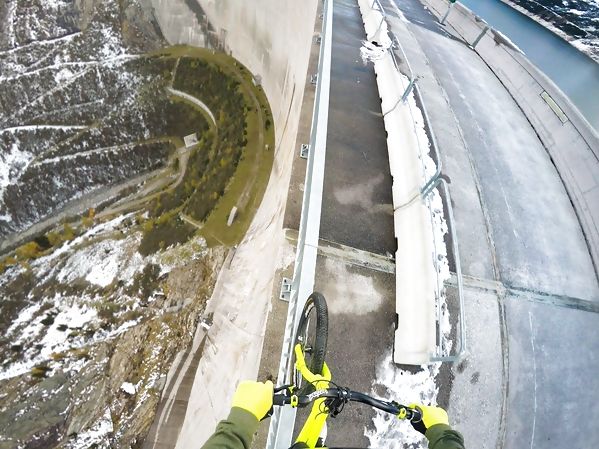 FABIO WIBMER ROULE À VÉLO EN ÉQUILIBRE SUR UNE RAMBARDE AU BORD DU BARRAGE KÖLNBREIN