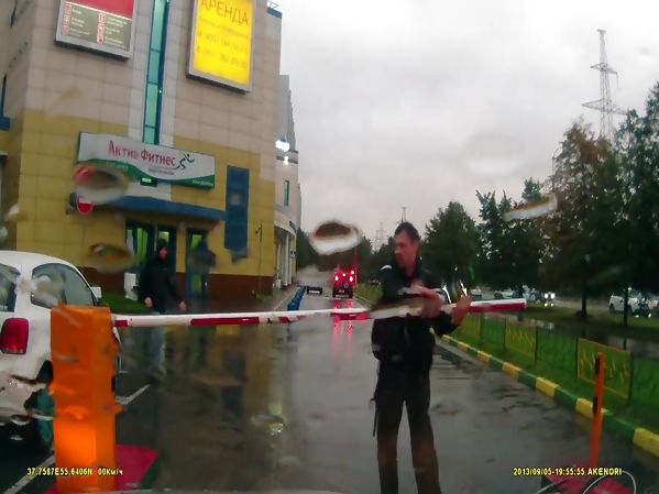 UN CYCLISTE IVRE ESSAIE DE FRANCHIR UNE BARRIÈRE QUI EST ABAISSÉE (RUSSIE)