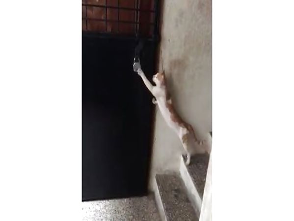 UN CHAT BIEN ÉLEVÉ FRAPPE À UNE PORTE POUR SIGNALER SA PRÉSENCE