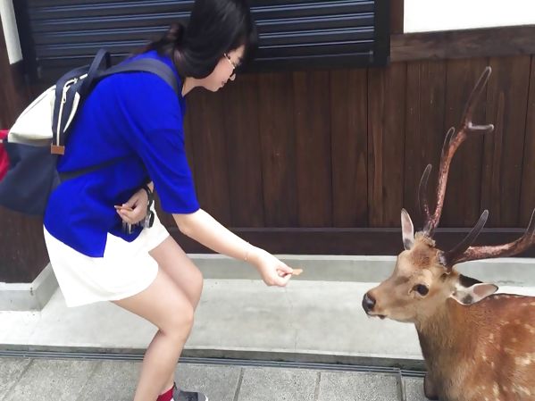 UN DAIM BIEN ÉLEVÉ SALUE UNE FILLE QUI LUI DONNE À MANGER (JAPON)